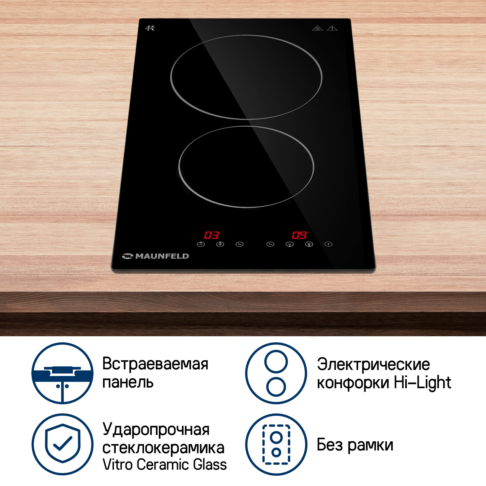 Отзывы на Электрическая варочная панель MAUNFELD CVCE292BK черная стеклокерамика, 1.2 кВт, 2 конфорки, быстрый нагрев, индикация работы