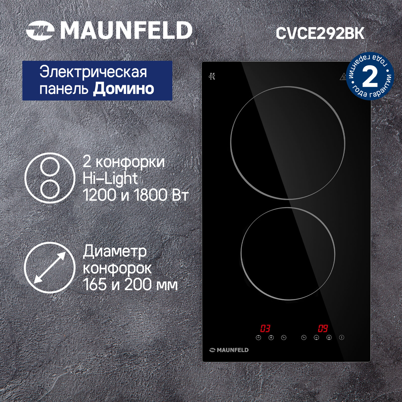 Электрическая варочная панель MAUNFELD CVCE292BK черная стеклокерамика, 1.2 кВт, 2 конфорки, быстрый нагрев, индикация работы информация: