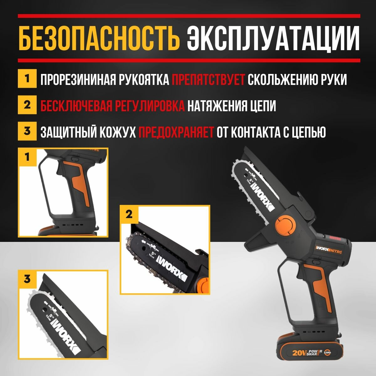 Пила цепная аккумуляторная бесщёточная WORX WG325E, 20В, длина шины 12см, с АКБ и З/У информация: