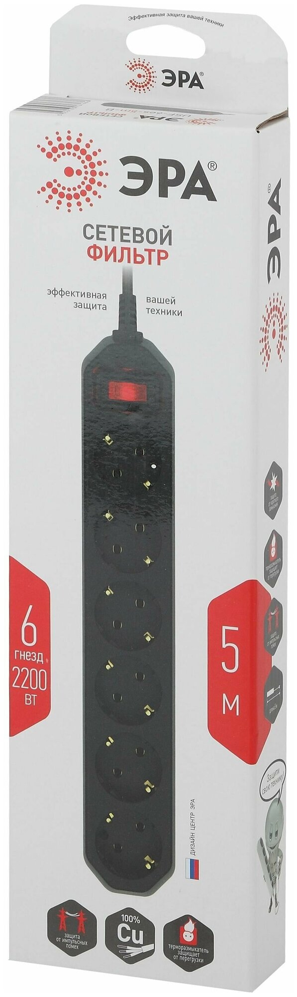 Сетевой фильтр Эра черный, 3 м, 6 розеток
