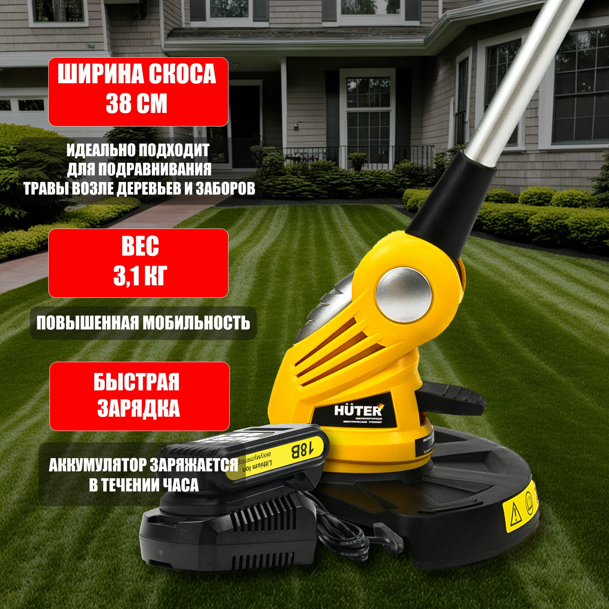 Отзывы на Аккумуляторный садовый триммер Huter 18 В, 2 Ач, Li-ion, АКБ косилка со скашиванием леской - 28 cм, 7000 об/мин.