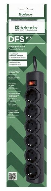 Сетевой фильтр Defender DFS 151, IP20, 6 розеток, 1.8м, чёрный