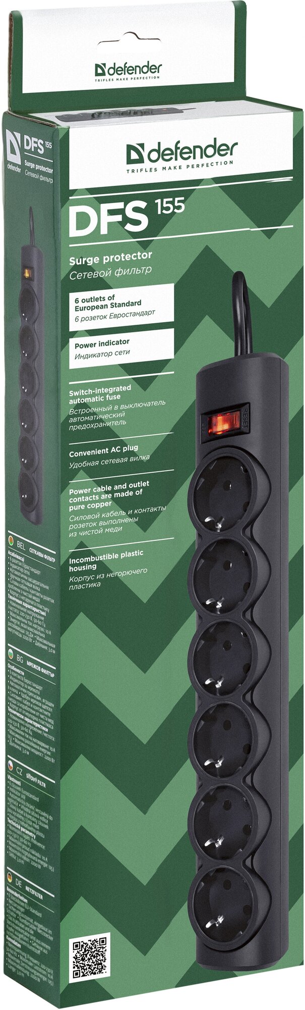 Defender DFS 155 (5 м, 6 розеток) Сетевой фильтр Defender DFS 155 5 м, черный, 6 розеток 99496 информация: