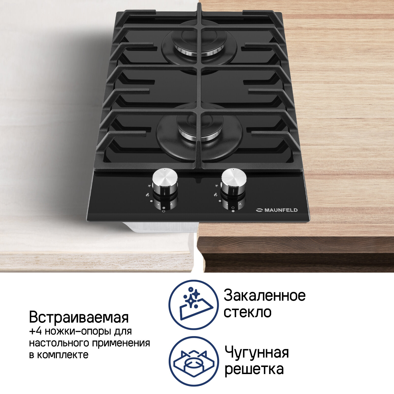 Газовая варочная панель MAUNFELD EGHG.32.6CB/G, 32 см ширина, Чугунные решетки, SABAF горелки, Электроподжиг, Газ — контроль, 36 мес. гарантия информация: