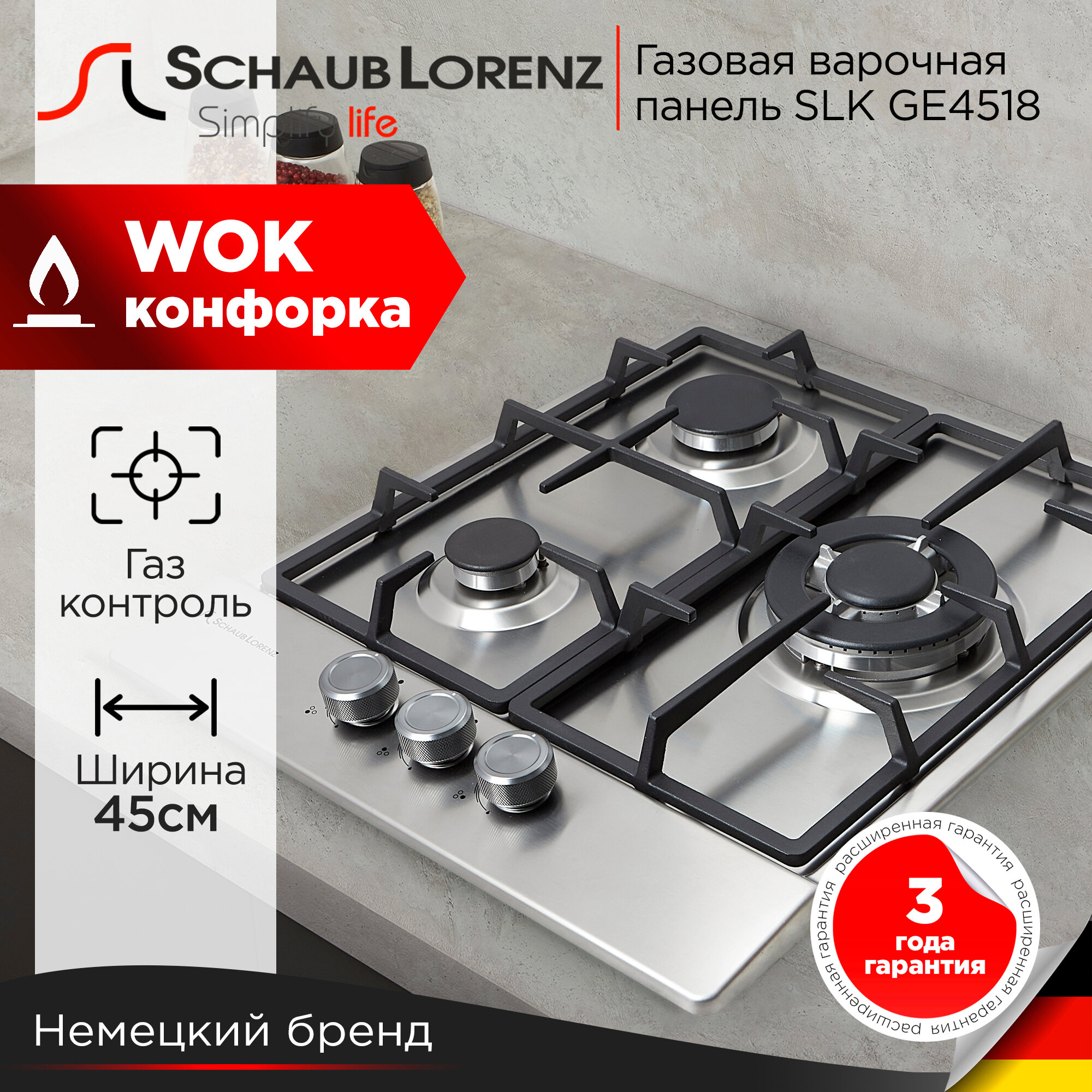Газовая встраиваемая варочная панель Schaub Lorenz SLK GW4540, 45 см, газ-контроль, электроподжиг, WOK