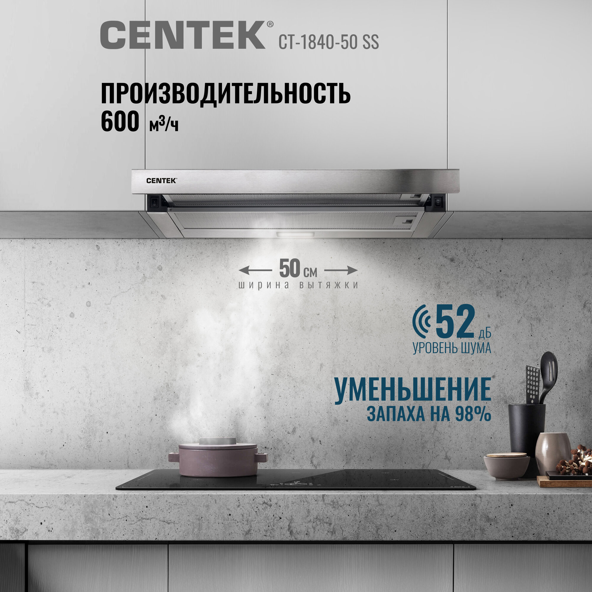 10 цен на Вытяжка для кухни 50см встраиваемая CENTEK СТ-1840-50 SS: сталь, 67Вт, 600 м3/час, LED подсветка, 2 скорости