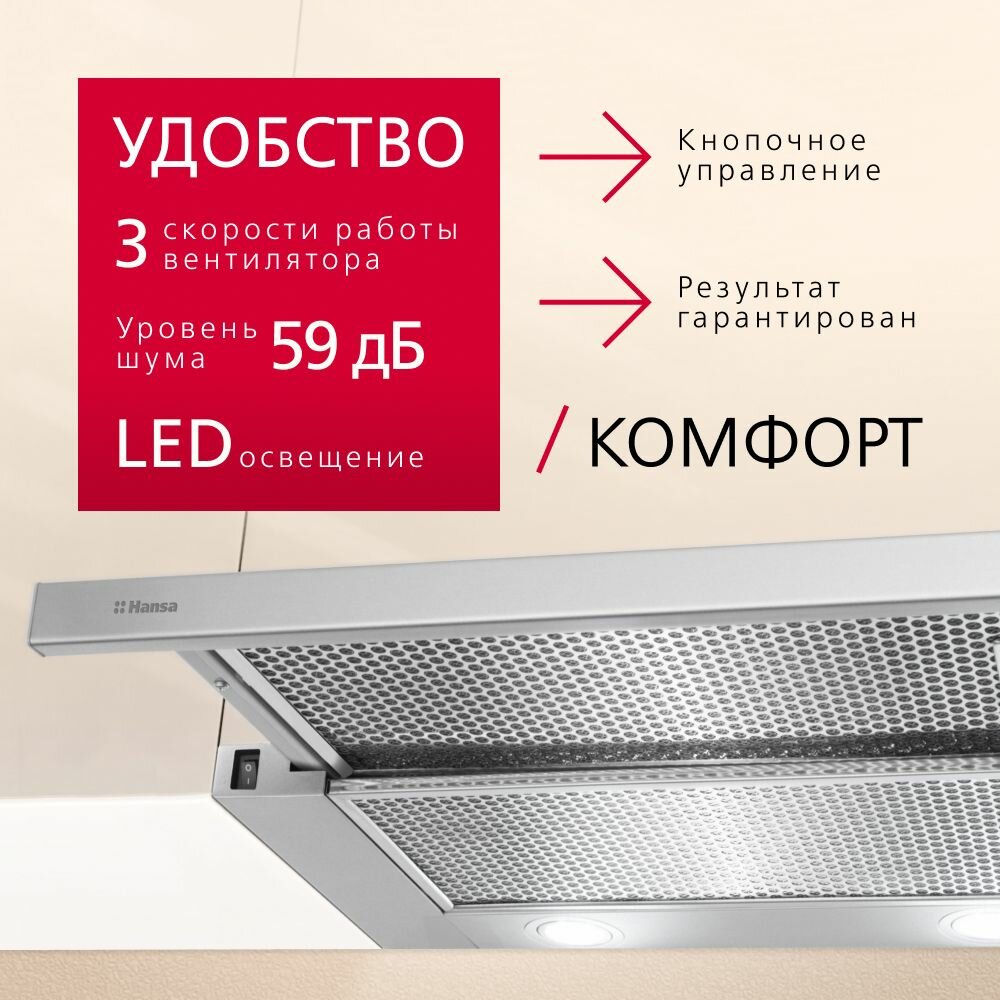 Вытяжка кухонная встраиваемая Hansa OTP6241IH, 60 см, 3 скорости, с функцией автовключение, LED подсветка, механическое управление 8 558 ₽