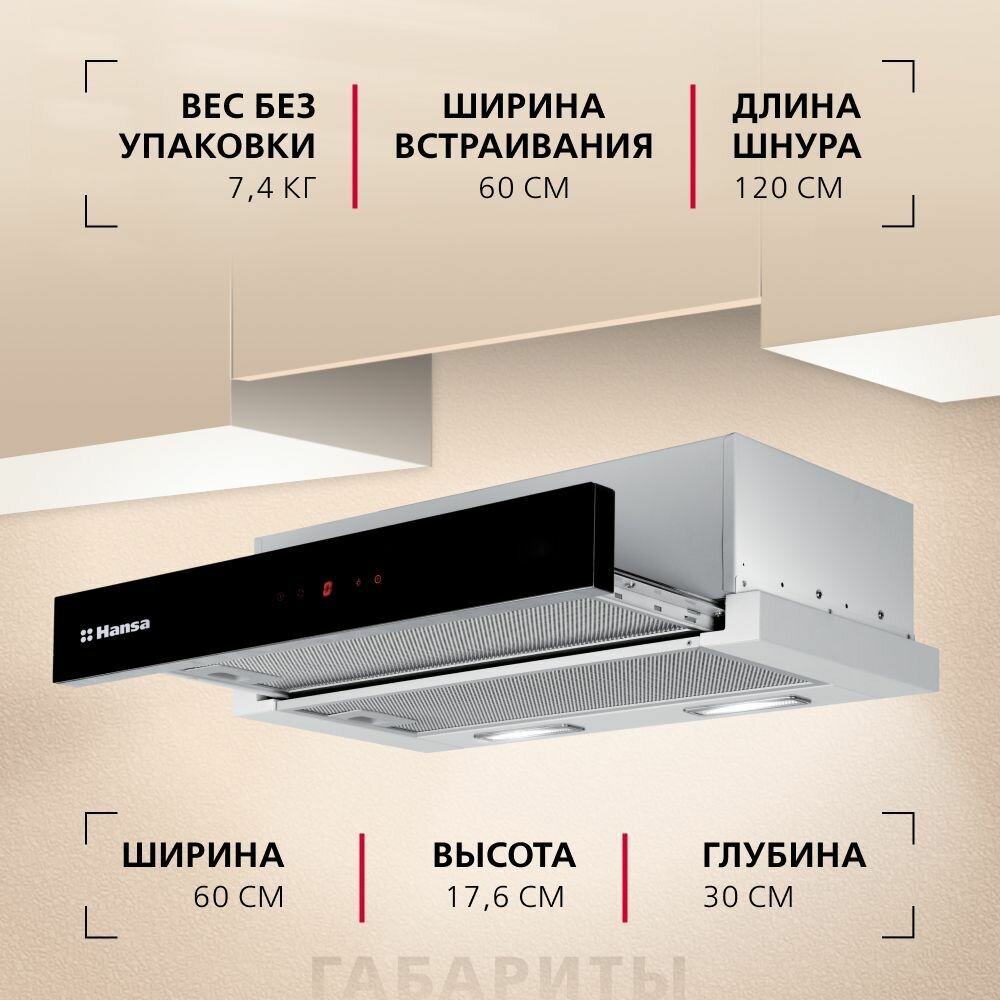 Вытяжка для кухни встраиваемая Hansa OTP6651BGH, 60 см, 3 скорости, с отсрочкой отключения, LED подсветка, сенсорное управление 9 990 ₽