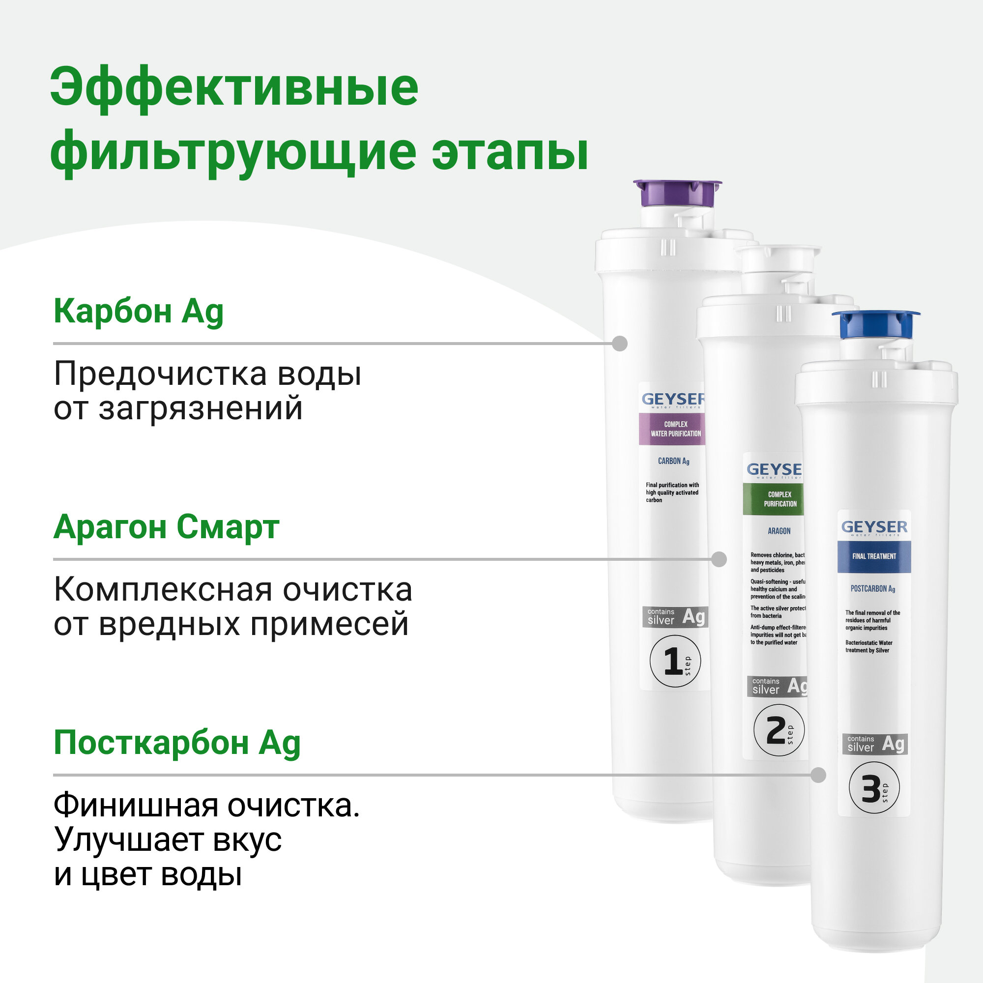 | Дополнительная информация | универсальный фильтр; этапы очистки: карбон Ag, арагон смарт, посткарбон Ag; крепление Quicklock для быстрой и легкой замены картриджей; макс. температура воды на входе: 40 °C; мин. температура воды на входе: 4 °C; макс. давление на входе: 7 атм; рекомендуемая производительность: 2 л/мин |