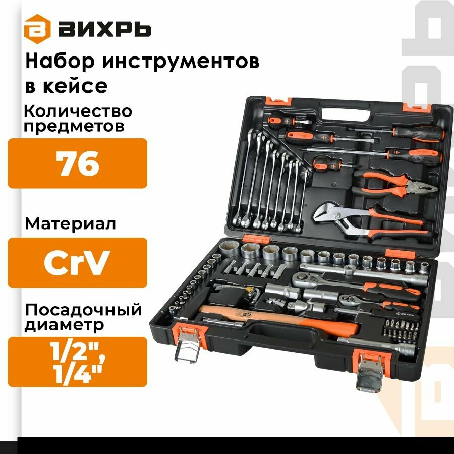 Набор инструментов вихрь, 1/2", 1/4", 76 предм, кейс