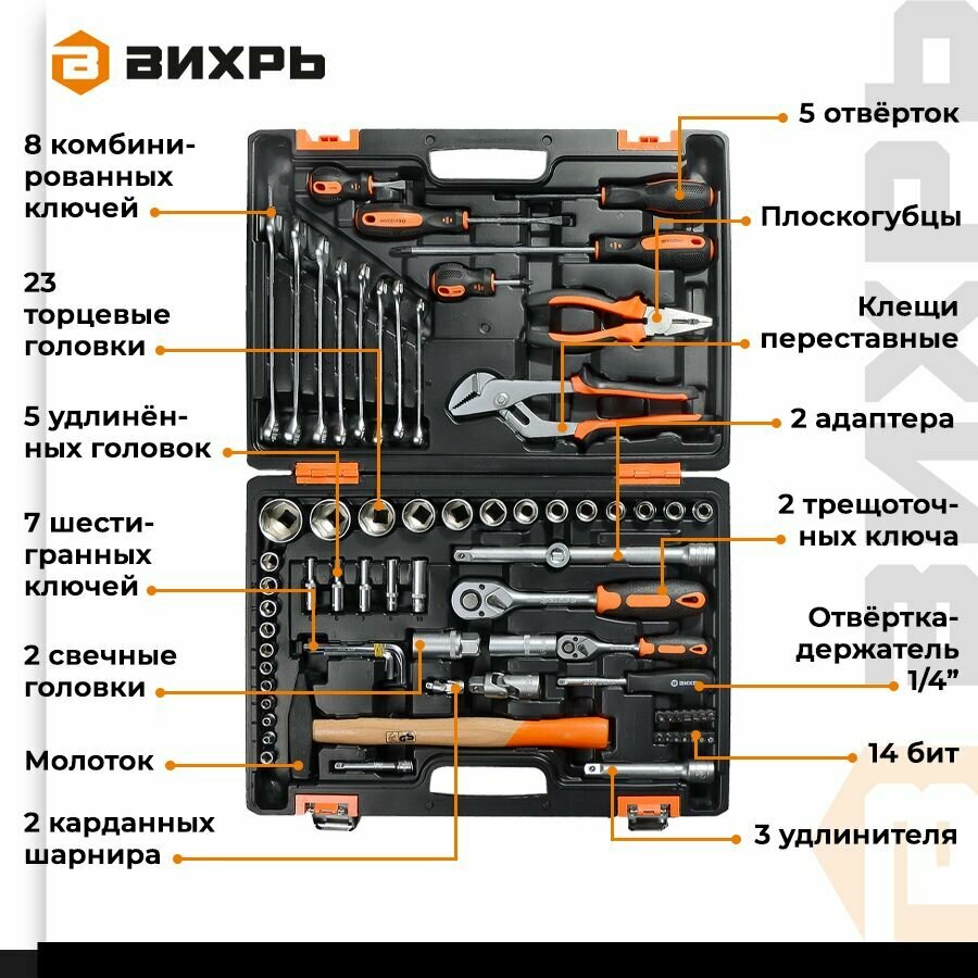Набор автомобильных инструментов вихрь 73/6/7/4, 76 предм., черный/оранжевый