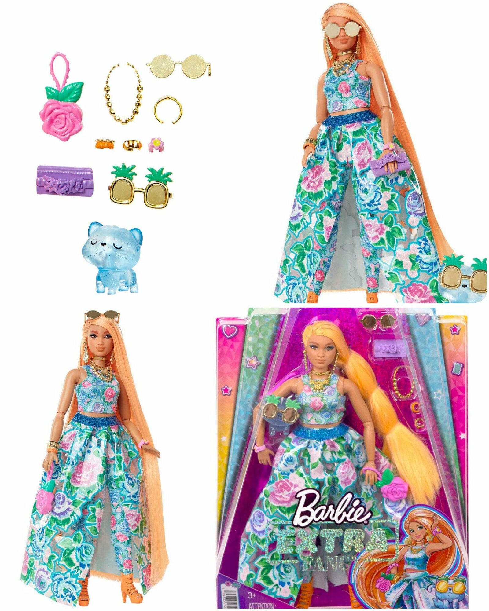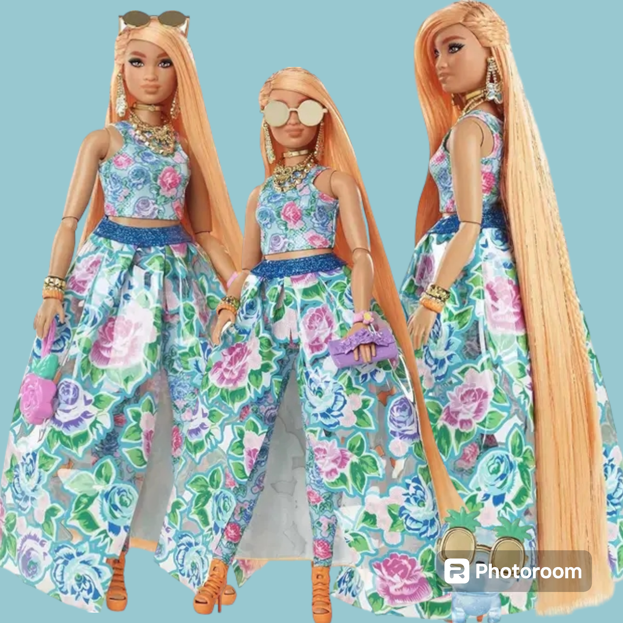 Barbie Extra Fancy Puppe im blauen Kleid mit Blumenmuster