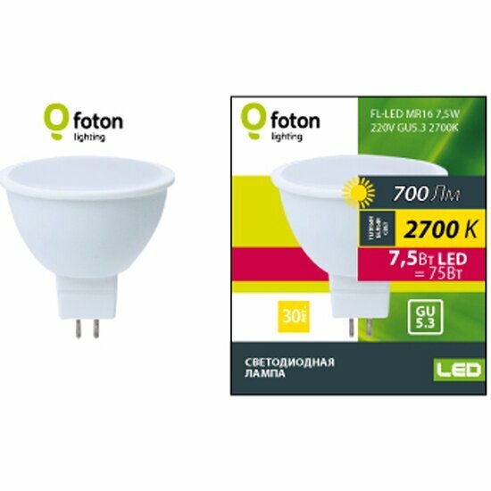 Лампа светодиодная FL-LED MR16 7.5W 220V GU5.3 2700K d50x56mm 700Лм FOTON теплый белый свет информация: