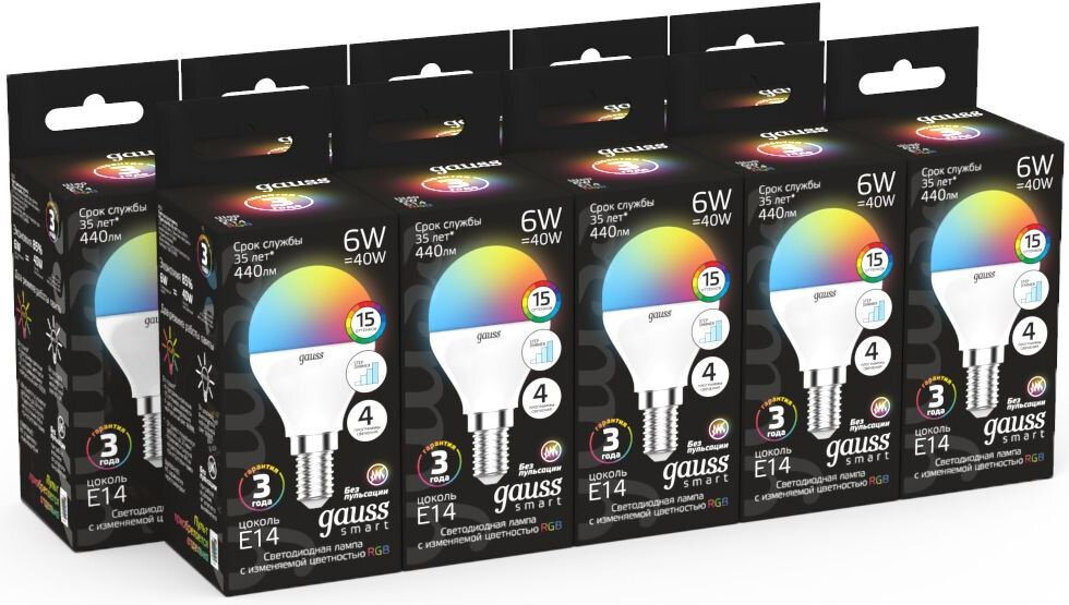 Лампа Gauss Smart LED, шар, G45, 6W, E14, RGBW+dim, 1/10/100 105101406