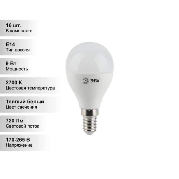 (16 шт.) Светодиодная лампочка ЭРА P45 9Вт 170-265В 2700К Е14 информация: