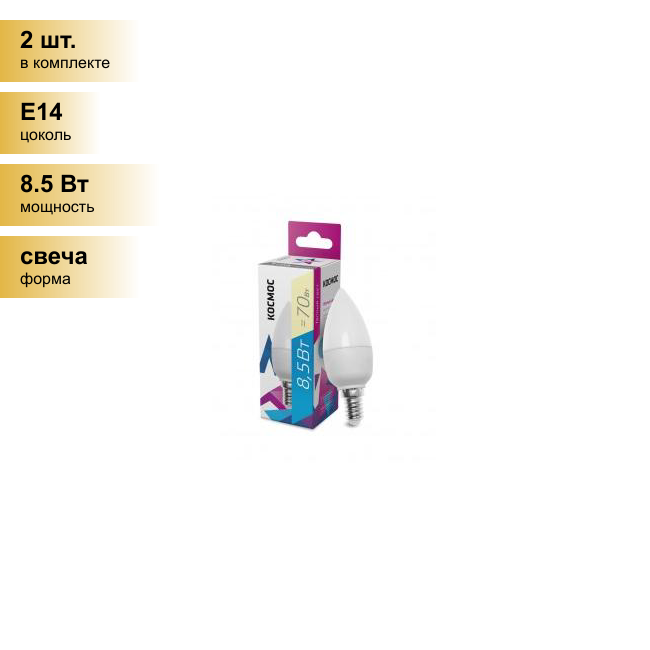 (2 шт.) Светодиодная лампочка Космос свеча E14 8,5W (8W) (720lm) 3000K 2K матов. 99x37 LkecLED8.5wCNE1430 . Цоколь E14 информация: