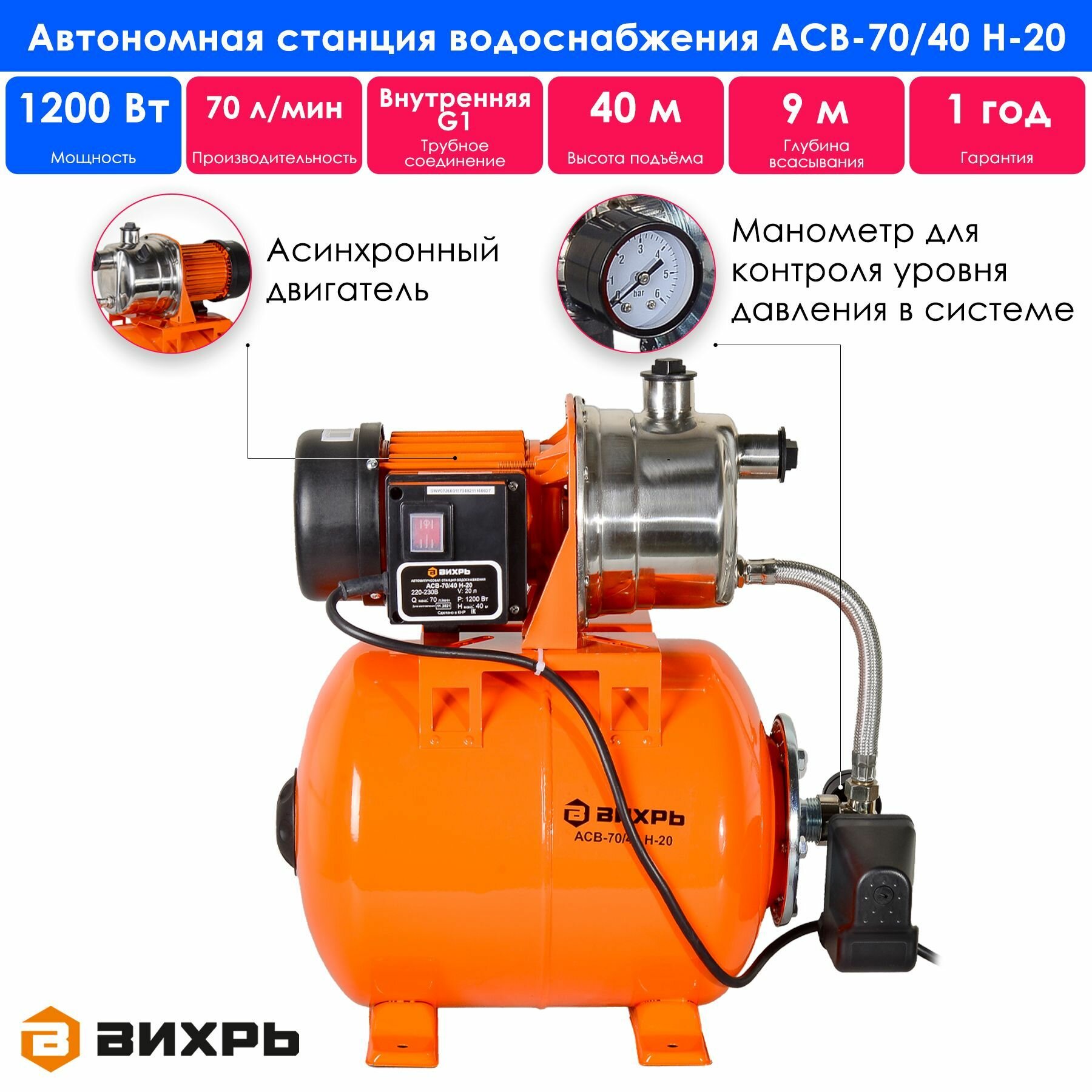 Насосная станция вихрь АСВ-70/40 Н-20 (1200 Вт)
