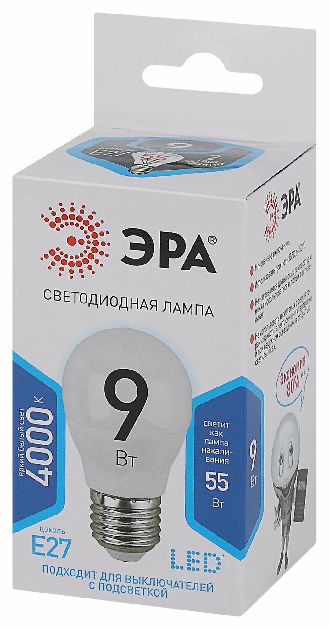 Лампочка светодиодная ЭРА LED P45-9W-840-E27 4000K шарик 9 Вт информация: