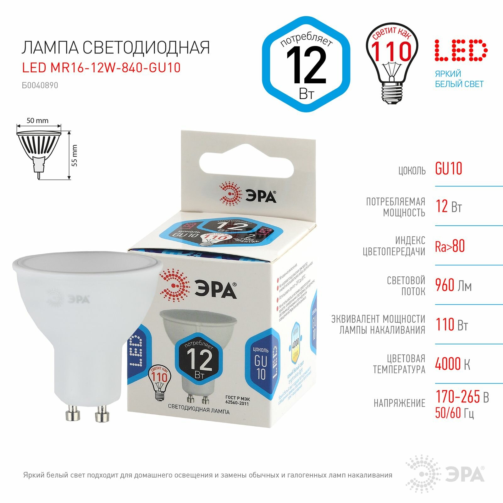 Лампочка светодиодная ЭРА (набор 10 штук) STD LED MR16-12W-840-GU10 GU10 12 ВТ софит нейтральный белый свет информация: