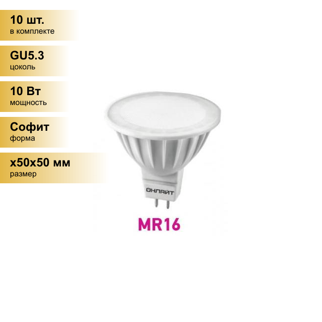 (10 шт.) Светодиодная лампочка онлайт MR16 GU5.3 220V 10W(700Lm) 3000K 2K 50x50 матов. ОLL-MR16-10-230-3K-GU5.3 61889 Нейтральный белый. Цоколь GU5.3 1 559 ₽