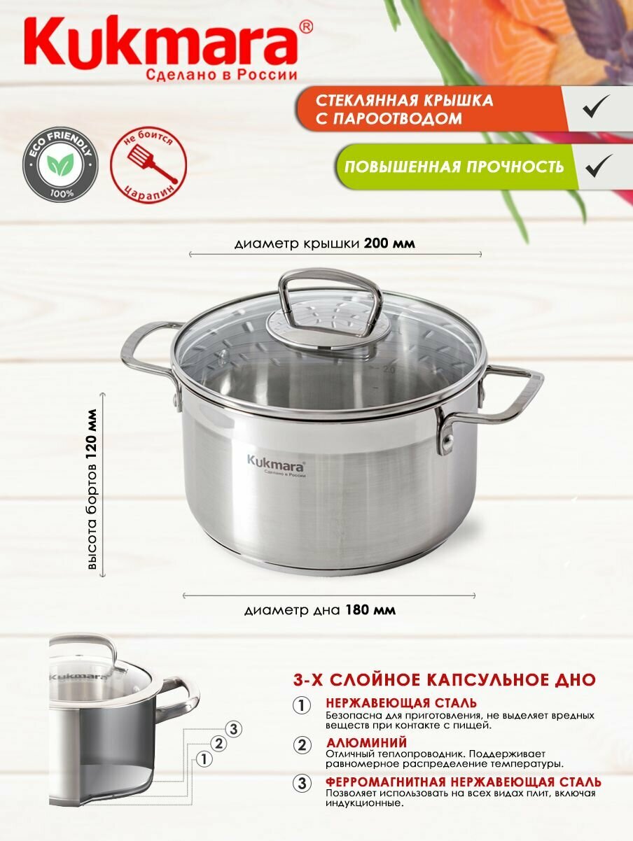 Кастрюля нержавеющая 3,5л со стеклянной крышкой ORION ТМ KUKMARA информация: