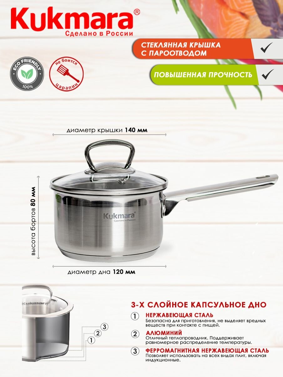 Кастрюля Kukmara Orion 1,0 литр, нержавеющая сталь, стеклянная крышка 14 см 2 400 ₽