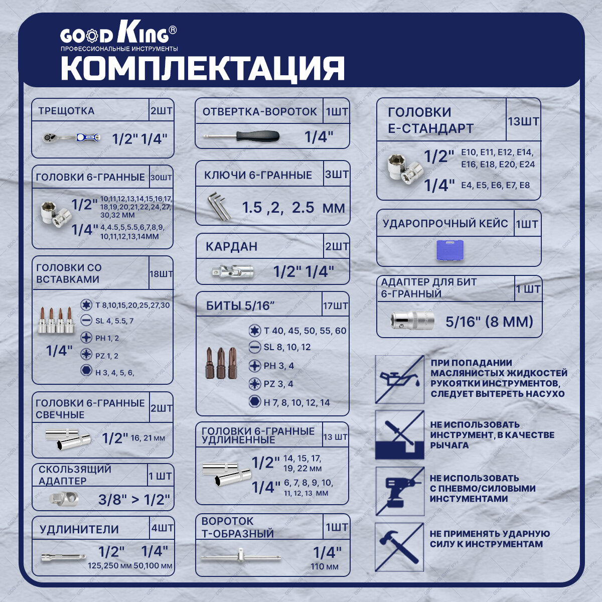 Отзывы на Набор инструментов GOODKING, 108 предметов, трещотка 1/2", 1/4", набор торцевых головок (B-10108)