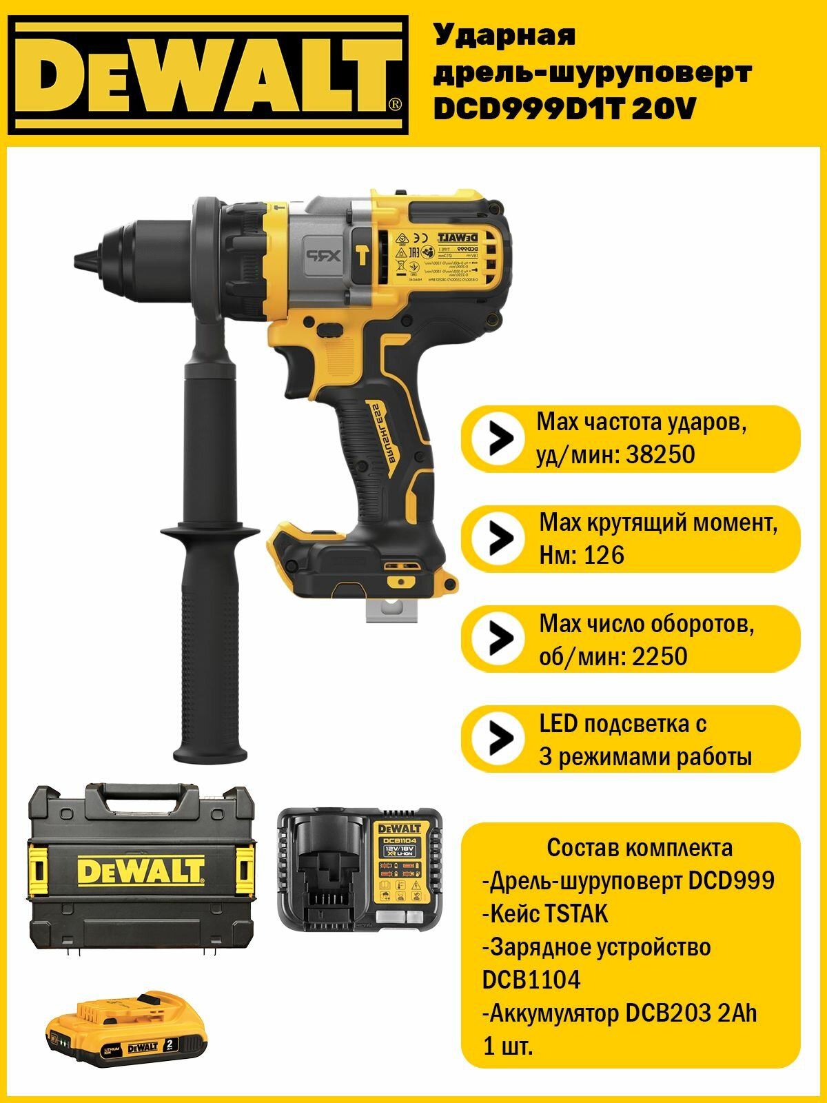 Ударная дрель-шуруповерт Dewalt DCD999 D1 (1 АКБ 2 Ач XR и ЗУ в кейсе TSTAK) информация:
