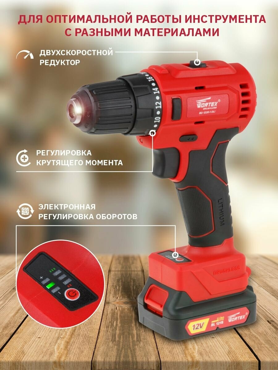 Аккум. дрель-шуруповерт WORTEX BD 1220-1 DLi в чем. (12.0 В, бесщёточный, 2 акк., 1.5 А/ч Li-Ion, бесщеточный, 2 скор., 40 Нм, шурупы до 6 мм) (BD1220