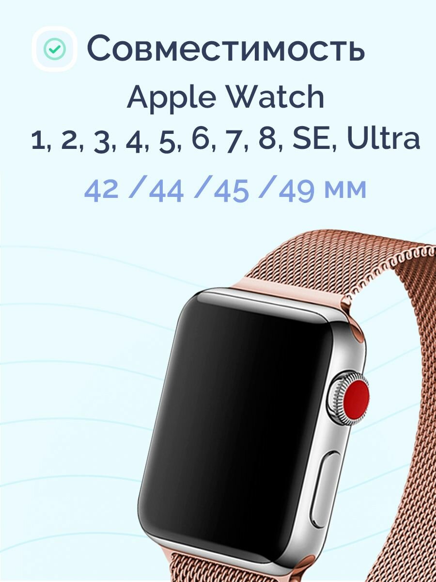 | Совместимость | Apple Watch 44 мм / Apple Watch 45 мм / Apple Watch SE 44 мм / Apple Watch Series 1 42/44/45/49 mm / Apple Watch Series 2 42/44/45/49 mm / Apple Watch Series 3 42/44/45/49 mm |