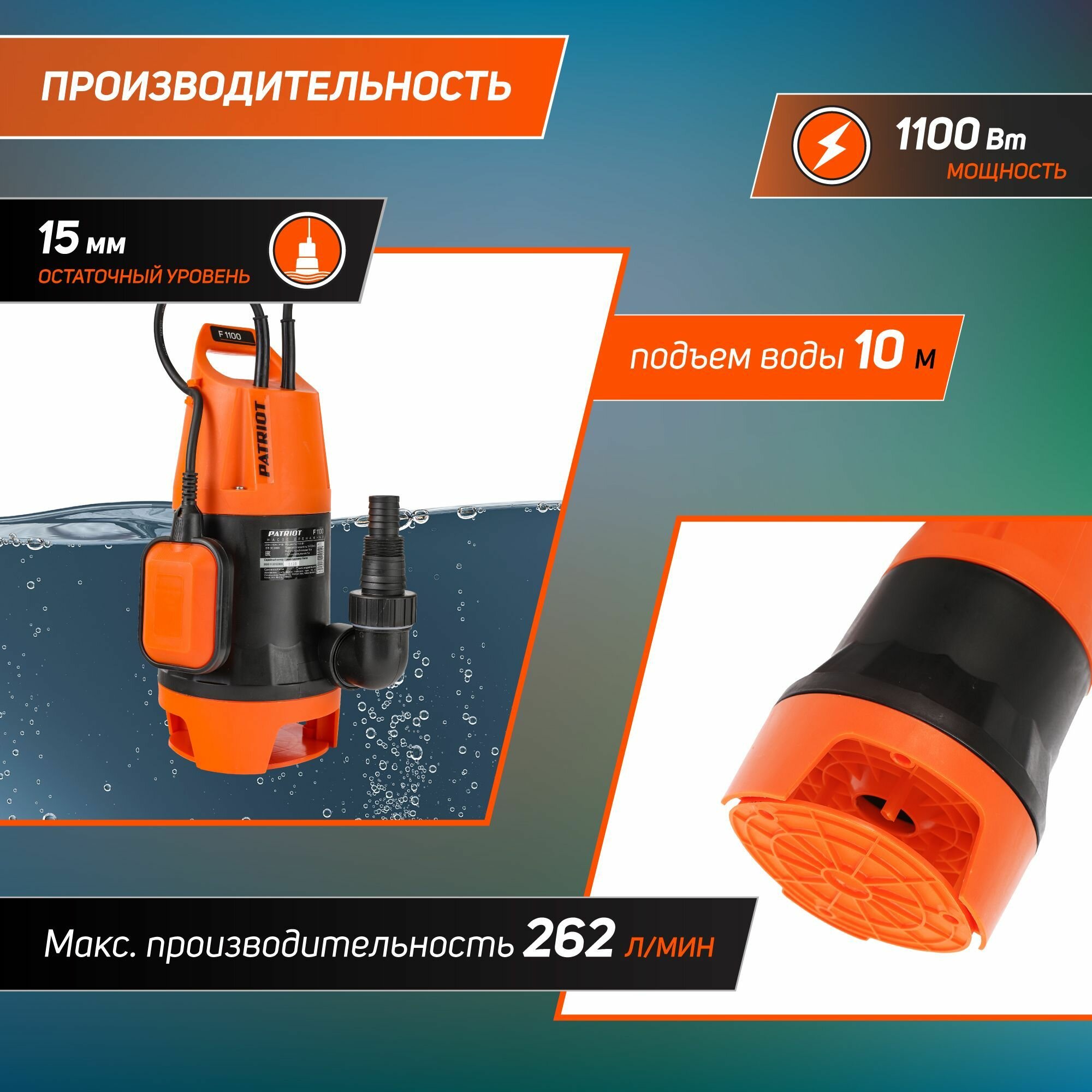 Насос дренажный PATRIOT 315302469 F 1100 15700 л/мин, 1100 Вт, оранжевый/черный информация: