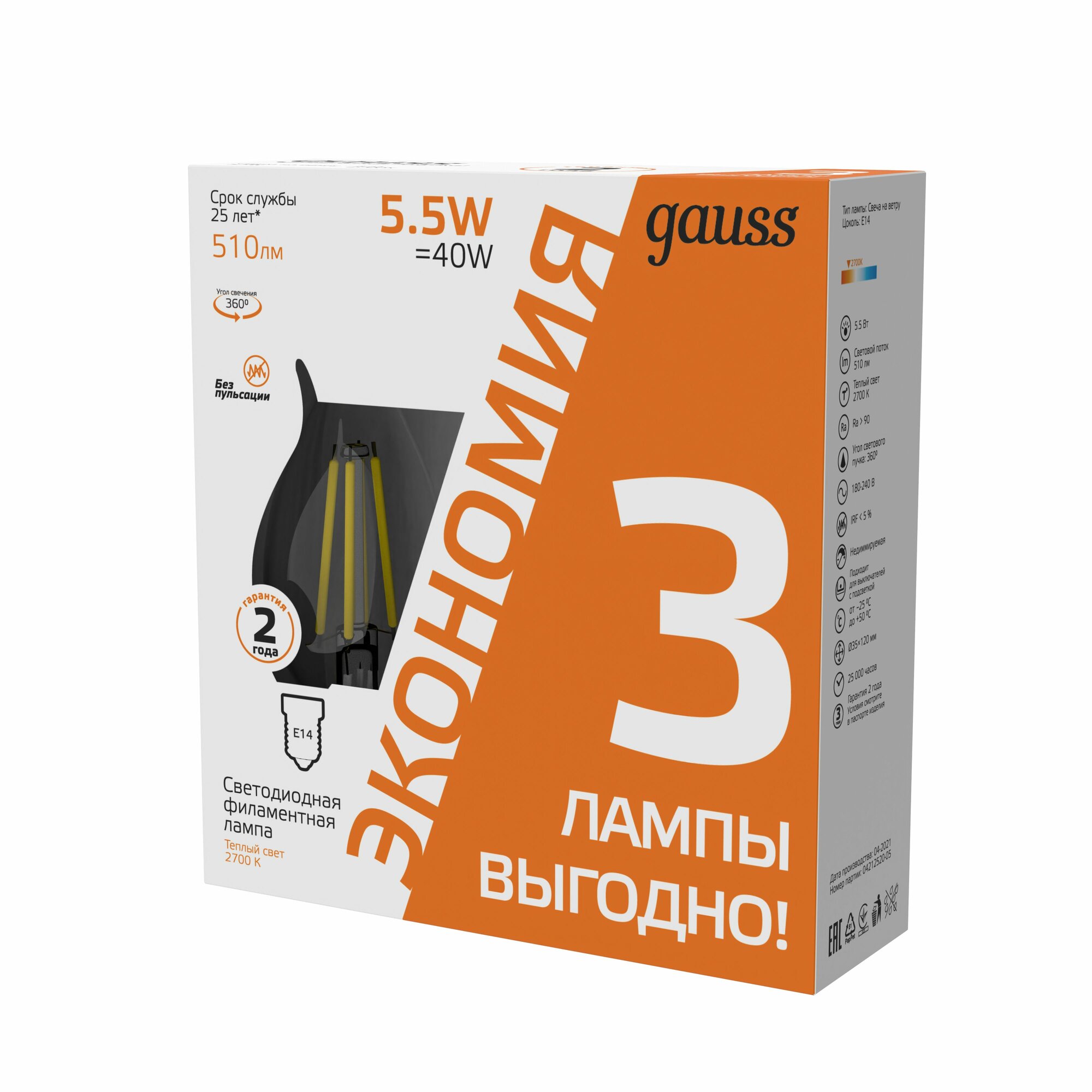 Лампочка светодиодная Е14 Свеча на ветру 5,5W Комплект 3 шт. теплый свет 2700К Gauss Filament информация: