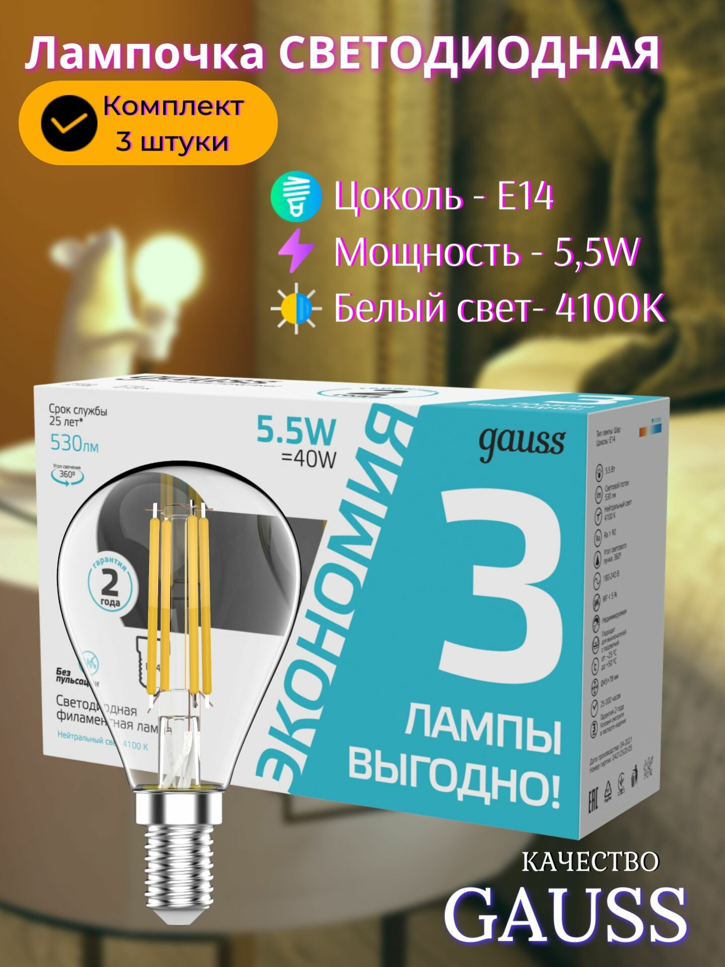 10 цен на Лампочка светодиодная Е14 Шар 5,5W Комплект 3 шт. нейтр белый 4100К Gauss Basic Filament