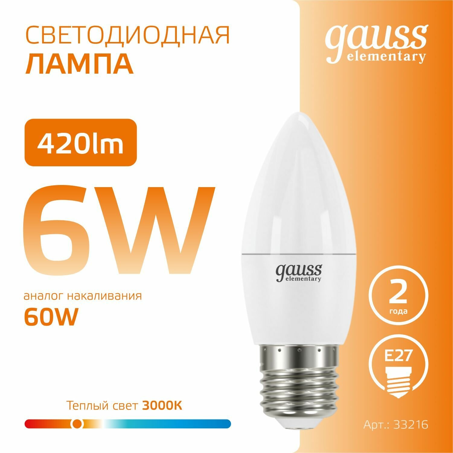 Лампочка светодиодная E27 Свеча 6W теплый свет 3000K упаковка 10 шт. Gauss Elementary