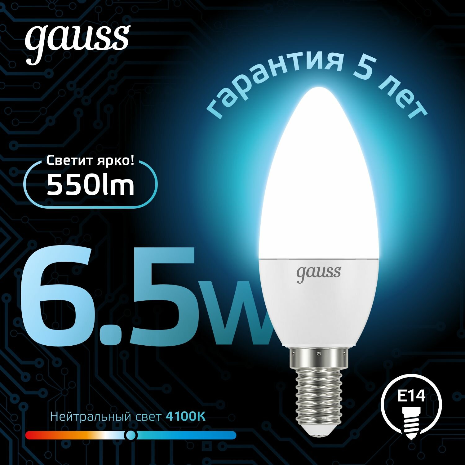 Лампочка светодиодная E14 Свеча 6.5W нейтр-белый свет 4100К упаковка 10 шт. Gauss 1 209 ₽