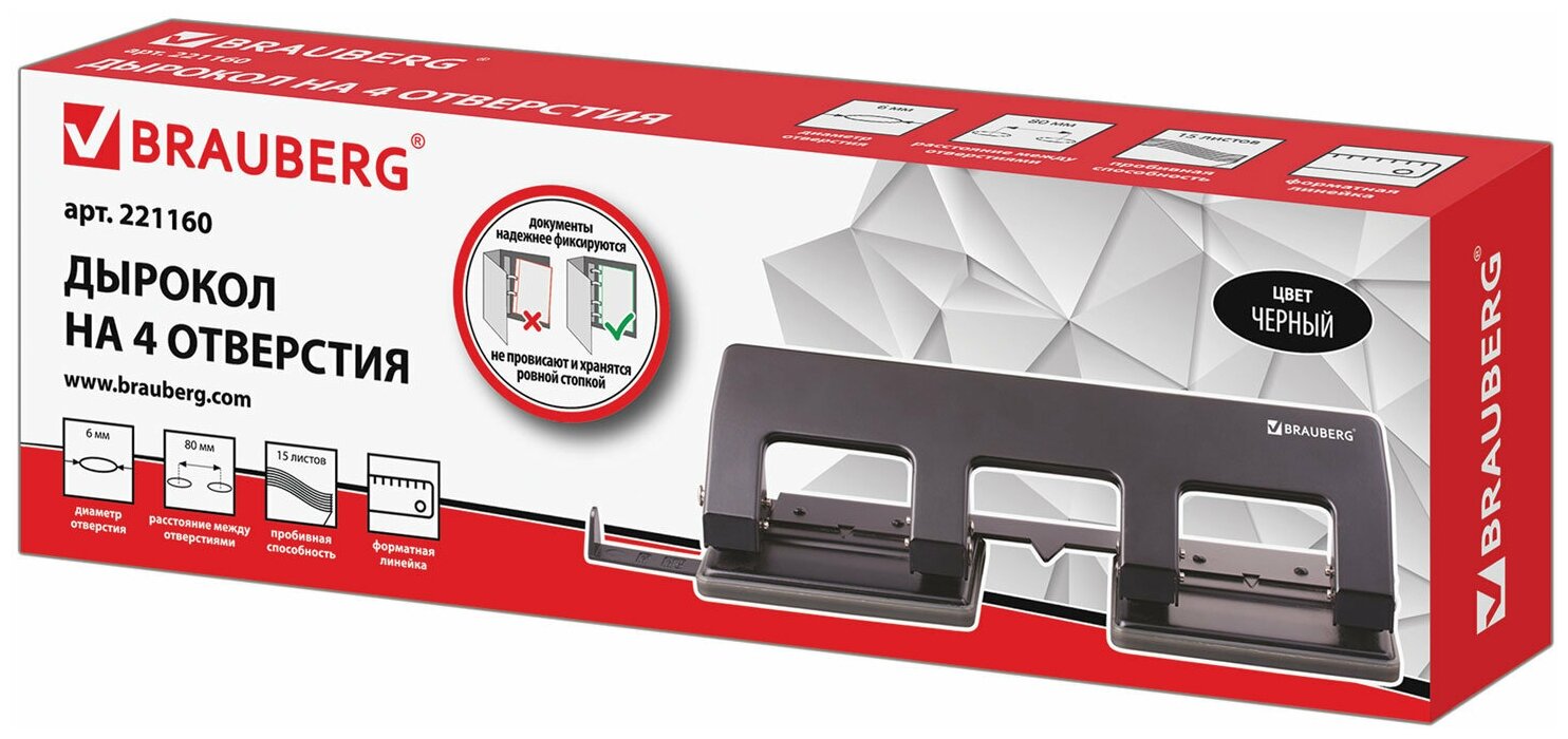 Дырокол металлический на 2-4 отверстия BRAUBERG "HL-4", до 15 л, черный, 221160 информация: