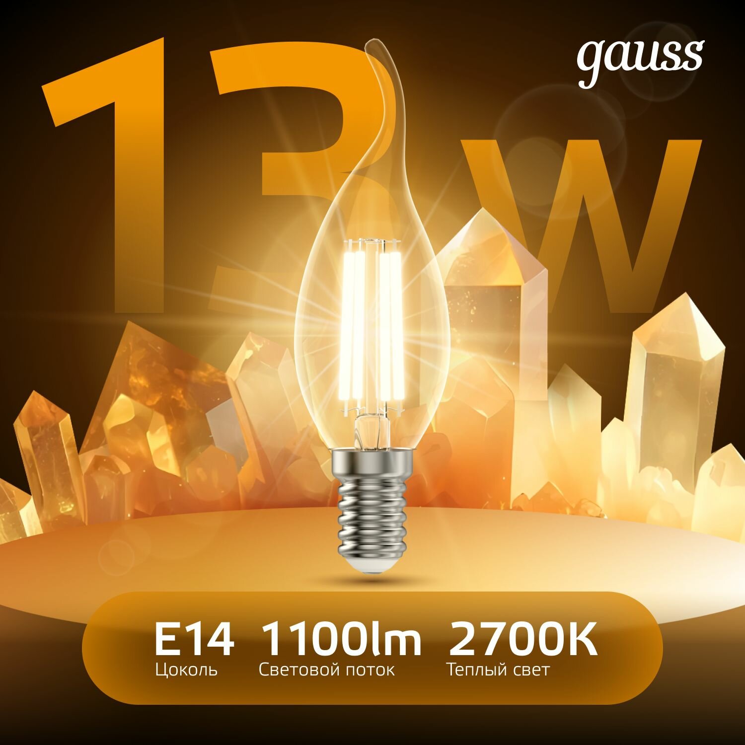 Лампа филаментная Gauss Filament, 13Вт, цоколь E14, белый теплый, 2700К (10шт) (104801113) 3 350 ₽