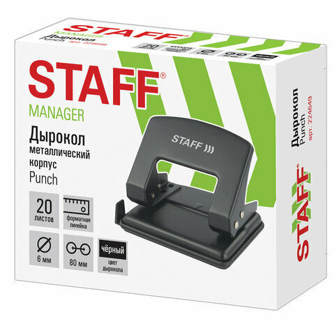 Дырокол STAFF "Manager", металлический средний, до 20 листов, черный, 224649 (цена за 1 ед.товара)
