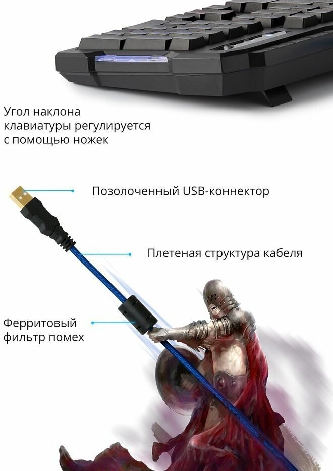 | Дополнительная информация | кабель в защитной оплетке, блокировка клавиши Windows, регулировка яркости подсветки, анти-фантомное нажатие до 19 клавиш одновременно, регулировка высоты клавиатуры, позолоченный USB-разъем |