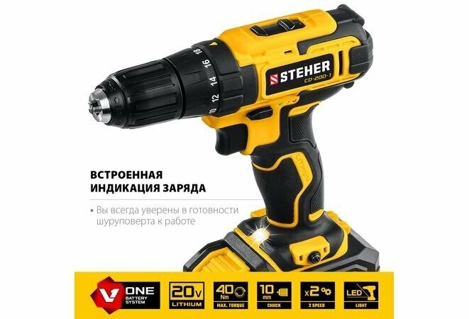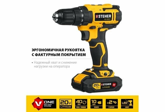 Дрель-шуруповерт, кейс (CD-200-1) STEHER V1, 20 В, 40 Н·м, 1 АКБ (2 А·ч)