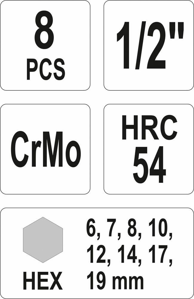 Набор головок-бит ударных HEX, 1/2 inch, 8 пр: 6, 7, 8, 9, 10, 12, 14, 17, 19 мм, в пластм. боксе YATO YT-1066 | цена за 1 шт