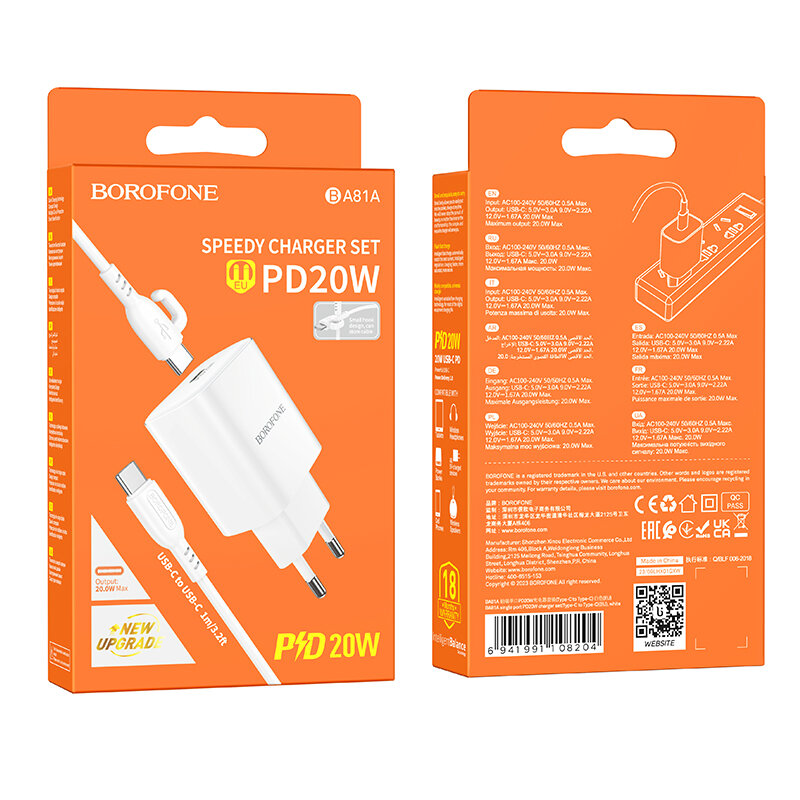 Сетевой адаптер Borofone BA81A PD, Type-C, с кабелем, 20Вт, белый, 1 шт информация: