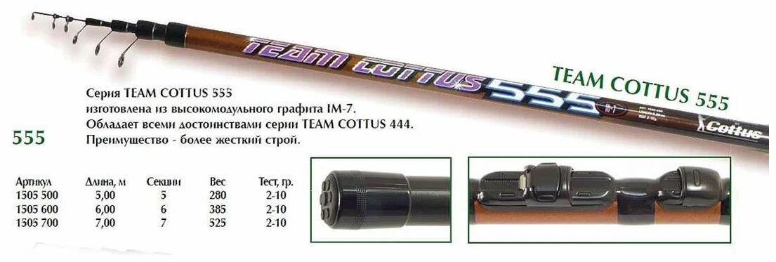Удилище Team Cottus 555 болонское 7м с кольцами 2-10гр Карбон М7 информация: