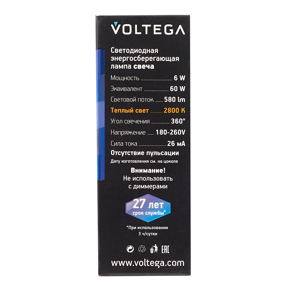 Voltega Лампа Светодиодная Свеча Е14 2800К 6W . информация: