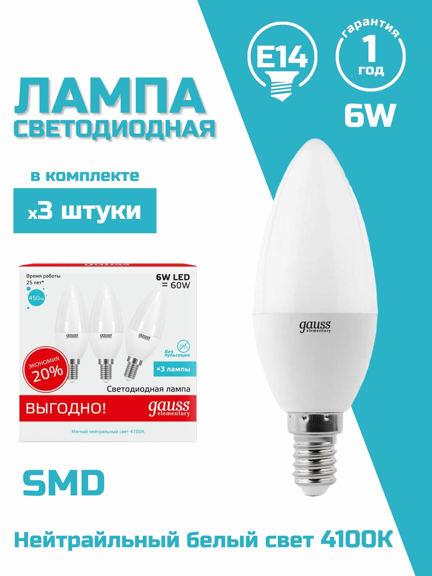 Лампочка светодиодная E14 Свеча 6W нейтр-белый свет 4100K (3 лампы в комплекте) Gauss Elementary 472 ₽