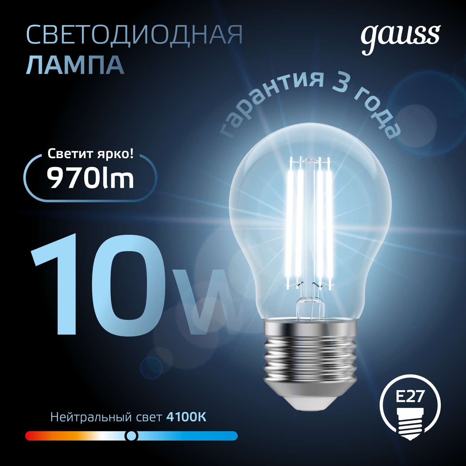 Набор из 10 штук Лампа Gauss Filament А60 10W 970lm 4100К Е27 LED 1/10/40 информация: