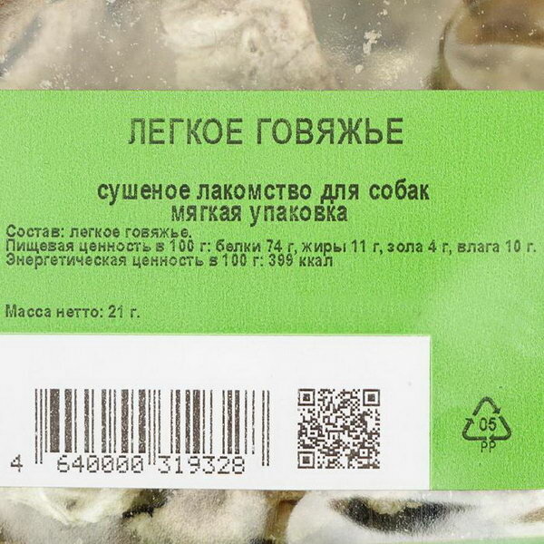 | Состав | легкое говяжье; пищевая ценность: белки 74 г, жиры 11 г, зола 4 г, влага 10 г |