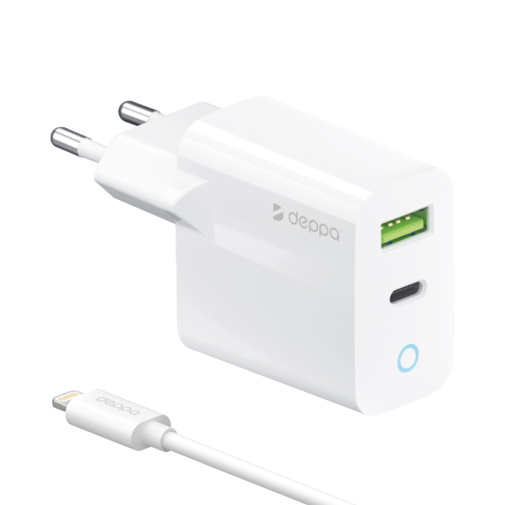 Сетевое зарядное устройство Deppa, USB-A + Type-C, кабель Type-C - Lightning, PD 3.0, QC 3.0, 20W, 1.2м, белая (11396)