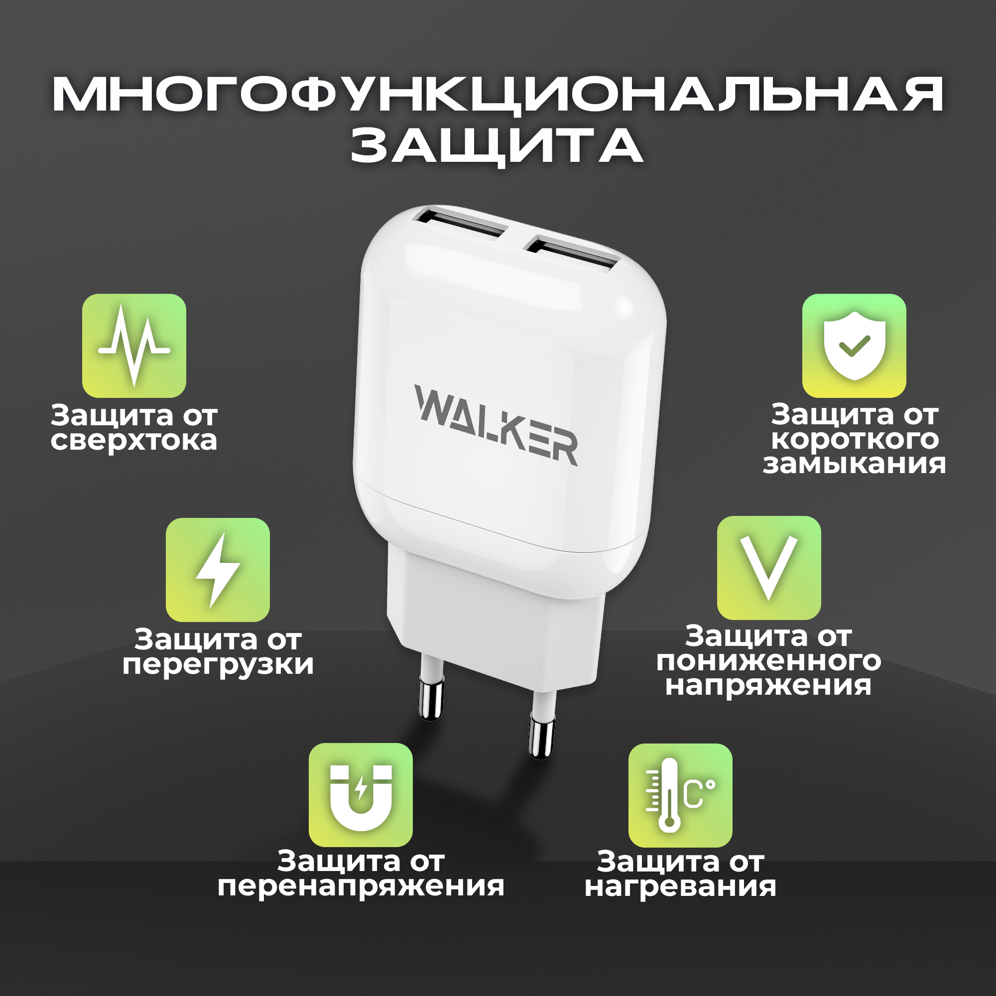 Зарядное устройство для телефона, 2 USB разъема по 2.4 A, мощность 12W, WALKER, WH-33, зарядка для iphone, блок питания на андроид, белый 398 ₽