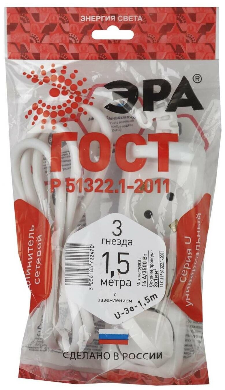 Отзывы на Удлинитель электрический ЭРА U-3e-1,5m-3x1 с заземлением 3 розетки 1,5м ПВС 3x1мм2 16А, Б0028369